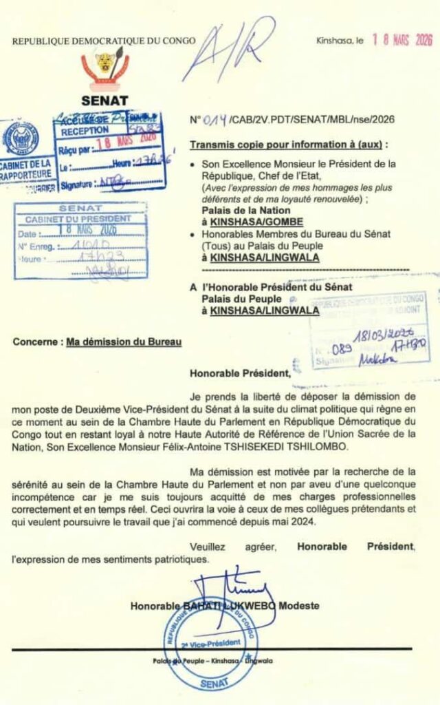 Modeste Bahati Lukwebo a annoncé, mercredi 18 mars 2026, sa démission du poste de deuxième vice-président du Sénat, mettant fin à plusieurs jours de tensions au sein de la chambre haute.
