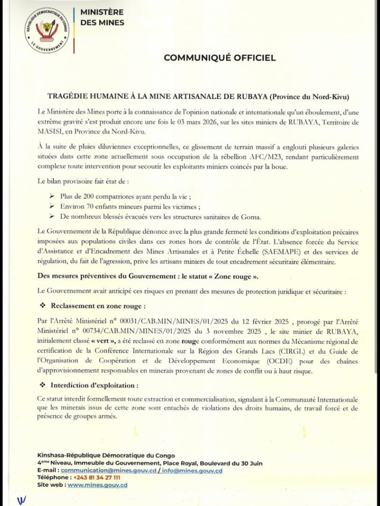 Le gouvernement de la République démocratique du Congo, à travers le ministère des Mines, a rendu public, le 4 mars 2026, un communiqué officiel relatif à la tragédie survenue la veille sur les sites miniers artisanaux de Rubaya, dans le territoire de Masisi (Nord-Kivu).