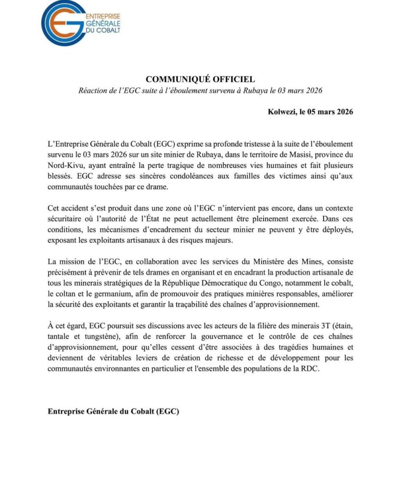 L’Entreprise Générale du Cobalt – EGC exprime sa profonde tristesse à la suite de l’éboulement survenu le 03 mars 2026 sur un site minier de Rubaya, dans le territoire de Masisi (Nord-Kivu).