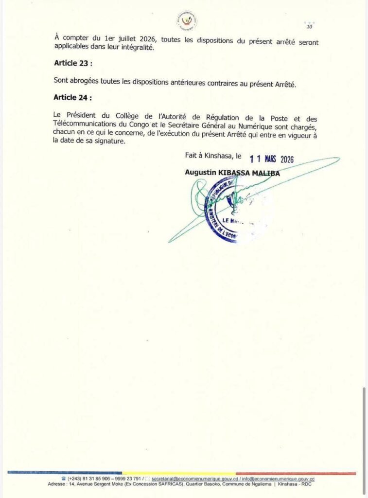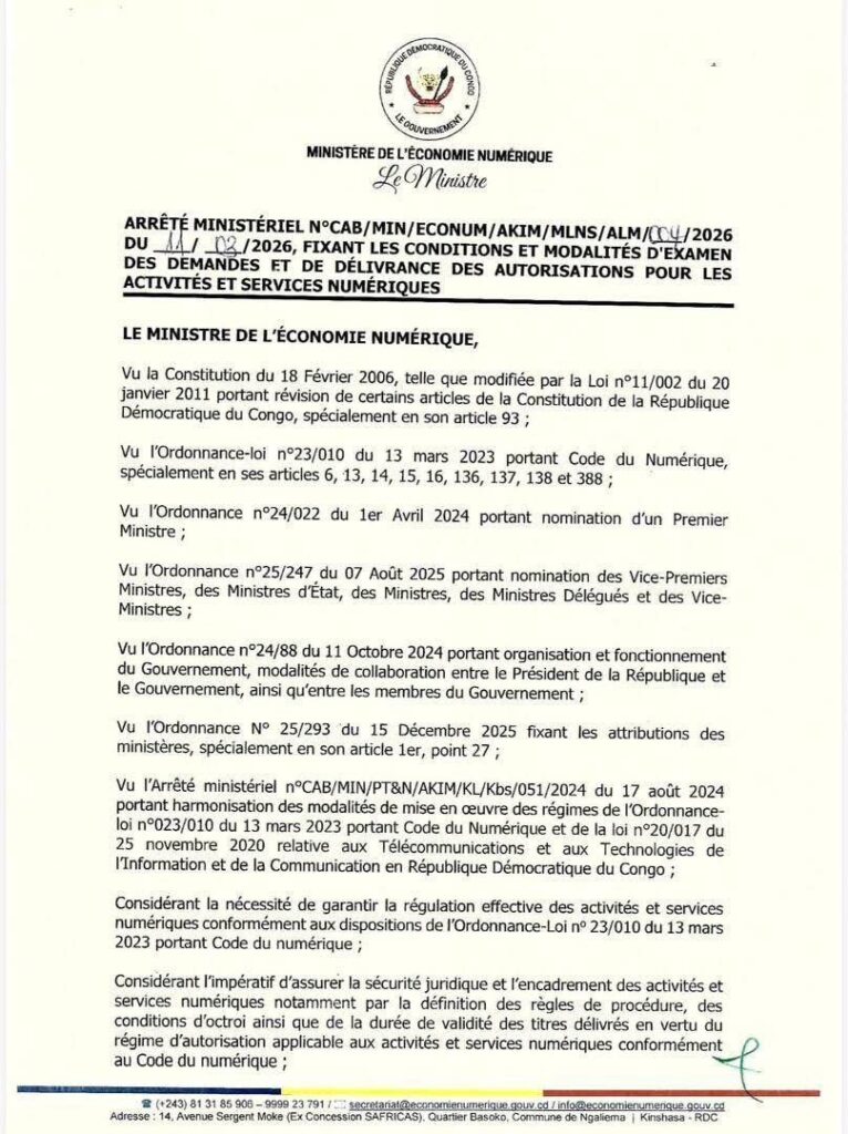 Le ministre de l’Économie numérique, Augustin Kibassa Maliba, a signé le 11 mars 2026 un arrêté ministériel établissant les conditions et modalités d’examen des demandes ainsi que de délivrance des autorisations pour les activités et services numériques en République démocratique du Congo.