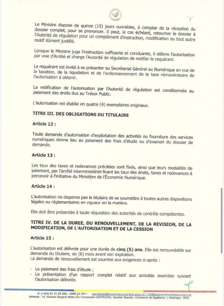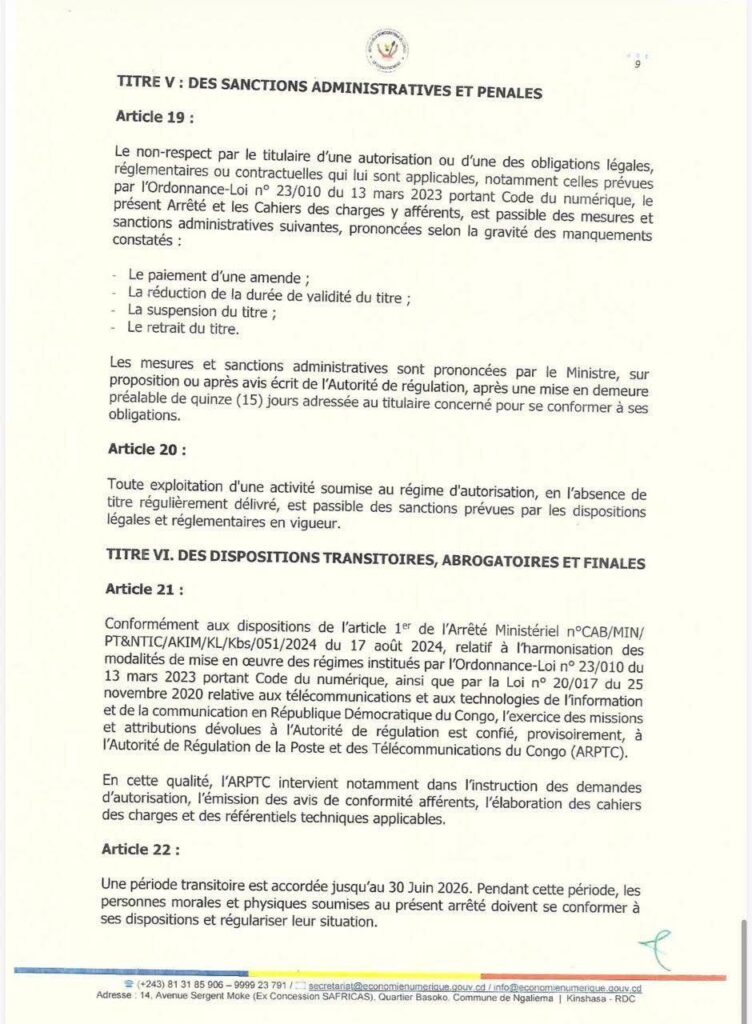 En confiant provisoirement à l’Autorité de Régulation de la Poste et des Télécommunications du Congo (ARPTC), l’instruction des dossiers et en imposant des délais précis pour la décision ministérielle, l’État entend structurer l’écosystème numérique et mettre fin à ce que certains qualifiaient de « Far West » numérique. Les opérateurs disposent d’une période transitoire jusqu’au 30 juin 2026 pour se conformer aux nouvelles exigences, sous peine de sanctions prévues par la loi.²