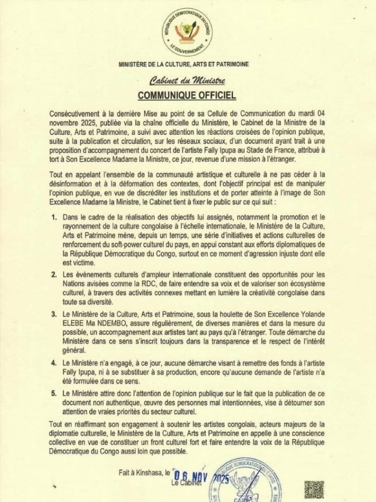 Dans un communiqué officiel, il dément tout financement du concert de Fally Ipupa et dénonce un document falsifié circulant sur les réseaux sociaux.