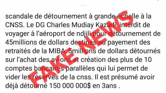 Depuis quelques heures, une image virale circulant sur les réseaux sociaux accuse le Directeur Général de la Caisse Nationale de Sécurité Sociale (CNSS), Charles Mudiay Kazadi, d’être impliqué dans un détournement massif de fonds. Après vérification, il s’avère que ces informations sont totalement infondées et relèvent de la pure « Fake News ».